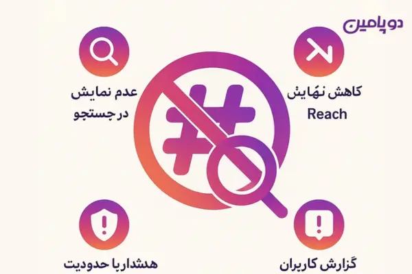 - استفاده از یک هشتگ ممنوعه میتواند باعث شود پست شما توسط الگوریتم کاهش دیده شود (shadow-ban) یا اینکه از نتایج جستجو یا برگه هشتگ حذف شود.
