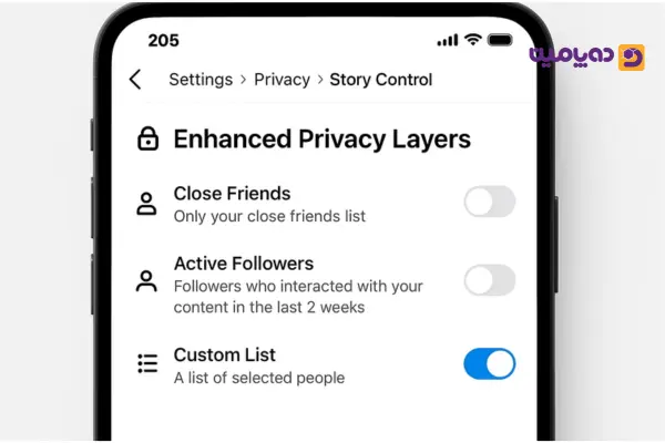 از مسیر Settings → Privacy → Story Control میتوانید مشخص کنید هر استوری توسط چه گروهی دیده شود؛ مثلاً فقط دوستان نزدیک یا دنبالکنندگان فعال. این ویژگی بخشی از قابلیت جدید Enhanced Privacy Layers است.